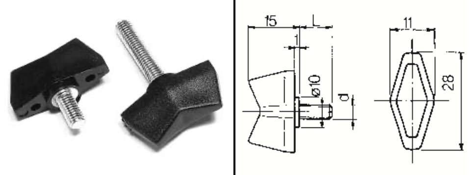 Křídlový šroub. Rozměry hlavy: 28 x 15 mm.