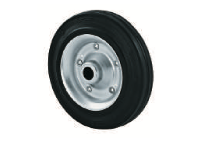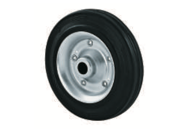 Kola transportní s černou pryžovou obručí na zinkovaném plechovém disku. Odolné chemickému prostředí. Odolné teplotě -10°C až +60°C. Uložení: jehlové ložisko